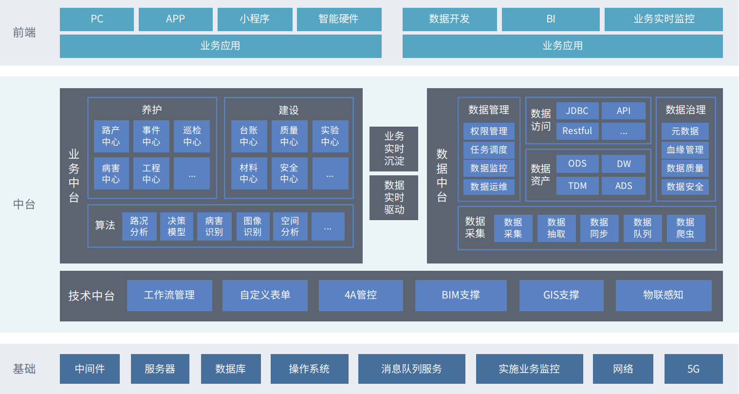智慧公路數(shù)字中臺以“業(yè)務(wù)+數(shù)據(jù)”雙中臺為核心技術(shù),面向公路管理部門及運營企業(yè)打造一站式中臺解決方案。涵蓋業(yè)務(wù)中臺、數(shù)據(jù)中臺、技術(shù)中臺等多個領(lǐng)域,旨在通過新一代數(shù)字化、智能化技術(shù),輸出本地化中臺產(chǎn)品,助力公路管理部門及運營企業(yè)構(gòu)建公路產(chǎn)業(yè)生態(tài)圈,幫助政府、企業(yè)實現(xiàn)高質(zhì)量的數(shù)字化轉(zhuǎn)型。