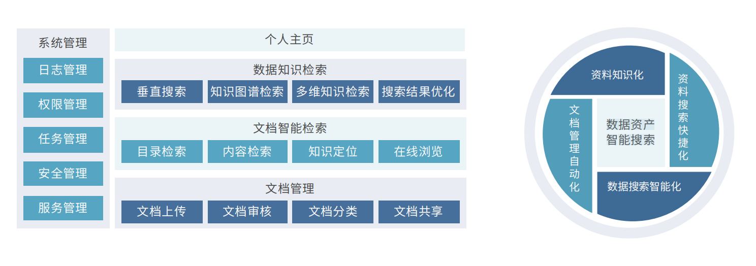 智能知識搜索是基于智識圖譜技術(shù)二次開發(fā)設(shè)計的對非結(jié)構(gòu)化數(shù)據(jù)資源搜索功能,它提供了一個分布式多用戶能力的全文搜索與定位引擎,主要包含知識主頁、文檔資料管理、結(jié)構(gòu)化數(shù)據(jù)獲取、文檔資料檢索、結(jié)構(gòu)化數(shù)據(jù)搜索、系統(tǒng)應(yīng)用功能搜索、詞庫管理、常用下載等功能模塊。從可以獲得的網(wǎng)絡(luò)資源中檢索出對用戶最有價值的信息。智能知識搜索具有信息服務(wù)的智能化、人性化特征,能夠采用自然語言進(jìn)行信息的檢索,提供更方便、更確切的搜索服務(wù)。
