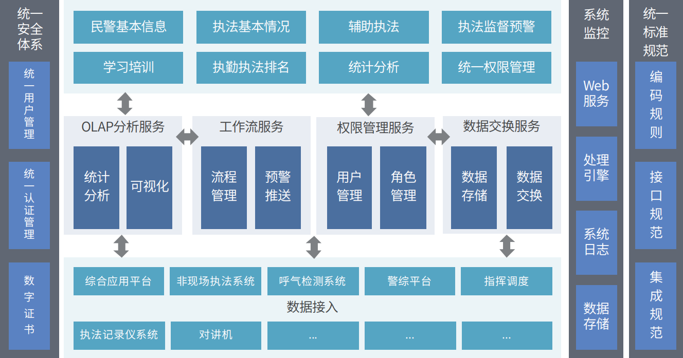 1. 應(yīng)用大數(shù)據(jù)技術(shù)集成執(zhí)勤、執(zhí)法相關(guān)各系統(tǒng)的結(jié)構(gòu)化、非結(jié)構(gòu)化數(shù)據(jù),完成相應(yīng)積分計算、執(zhí)法監(jiān)督預(yù)警預(yù)警等。